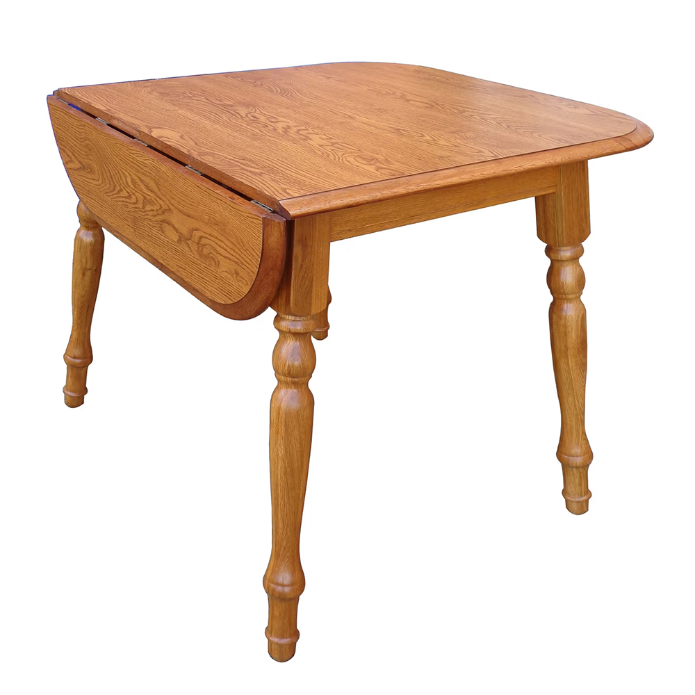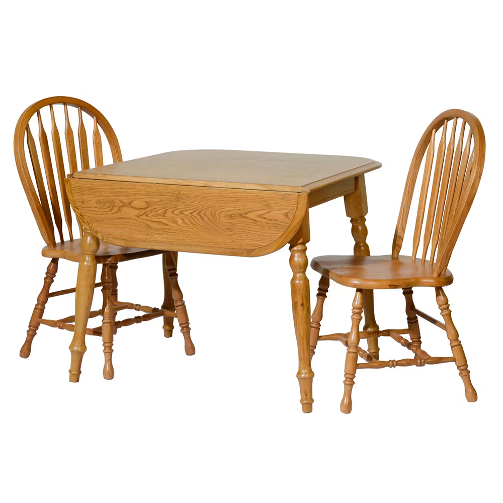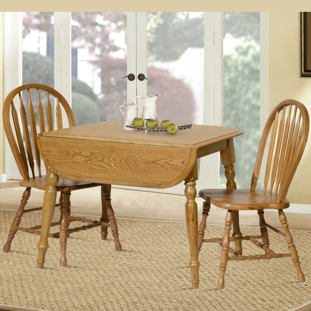 Dropleaf table is 27″ with 2 9″ leaves extending the table to 45″. Laminated top with solid oak band, legs & chairs.