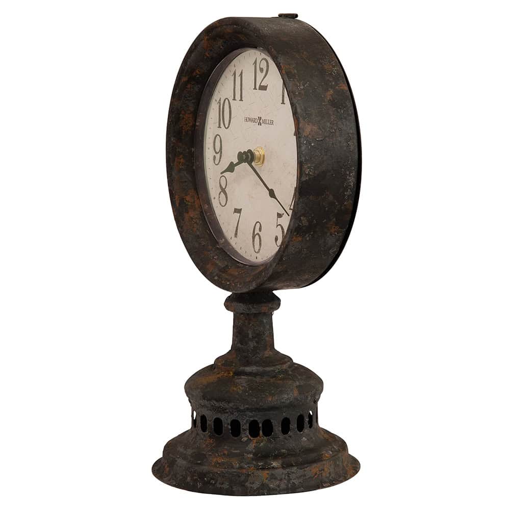 This round, metal mantel clock is finished in antique black with gray and rusty brown undertones for an aged appearance and stands 12.25″ tall. The distressed antique white dial features aged and distressed black Arabic numerals, black spade hour and minute hands and a convex, shatter-resistant crystal. Foam pads on bottom protects your table or mantel top. Quartz, battery-operated movement requires one AA sized battery (not included).