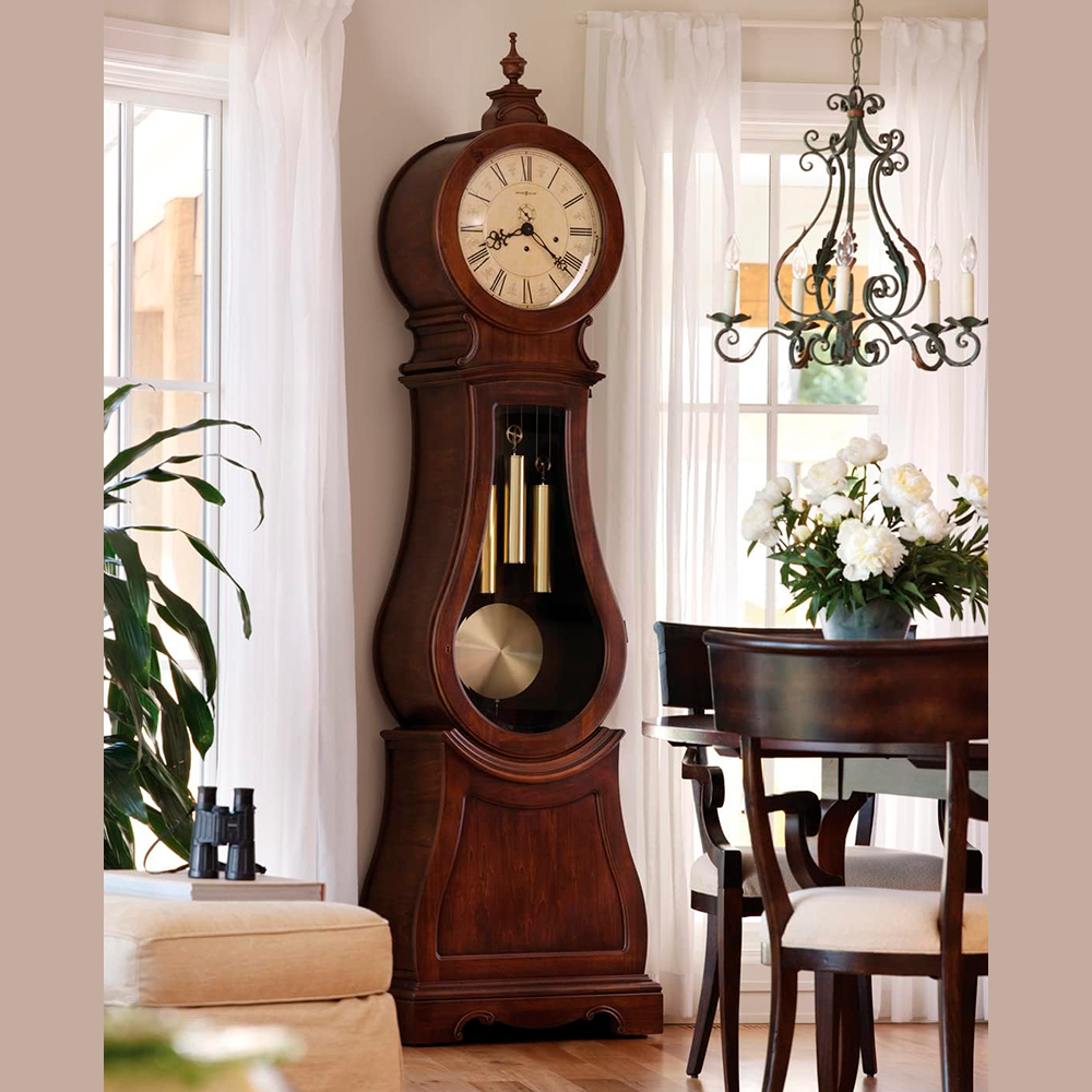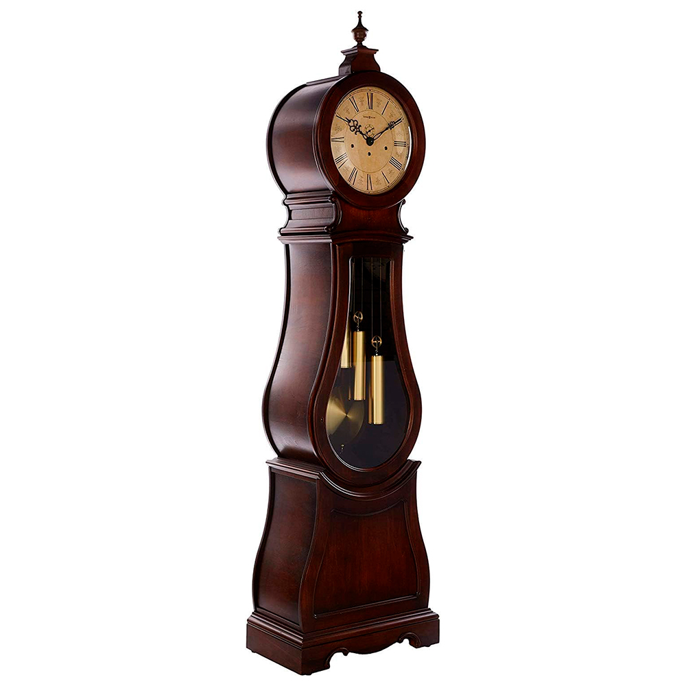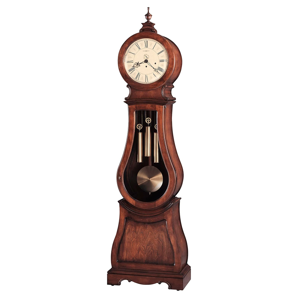 Tuscany Cherry finish on select hardwoods and veneers is lightly distressed for an aged appearance. Influenced by Scandinavian design, this floor clock is a unique addition to our Furniture Trend Designs Collection. Special details include a convex glass crystal on the hinged top door, decorative carved accents, and a turned urn finial to provide the crowning touch. The finial and finial base are removable. Aged to match the era, the antiqued dial offers Roman numerals, black serpentine hands, and a separate track for counting seconds. The weight shells are finished in brushed, antique brass, which is echoed by the circular brushed antique brass bob on the wood pendulum. Beveled glass on the mid-door defines the clock′s curved shape, and a decorative cutout and carvings enhance the sculpted base. A high-precision, German-made, Kieninger® cable-driven, Westminster chime plays 1/4, 1/2, and 3/4 chimes accordingly with full chime and strike on the hour. Automatic nighttime chime shut-off option. Adjustable levelers under each corner provide stability on uneven and carpeted floors. Locking door for added security. Heirloom Record Document with brass-finished capsule is included. Two year warranty on parts and workmanship.