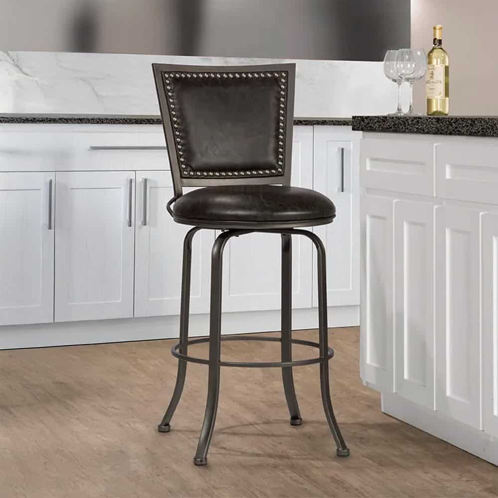 Commercial grade 24″ counter stool featuring a Charcoal finish with Charcoal water and stain resistant Solution Dyed Acrylic fabric.