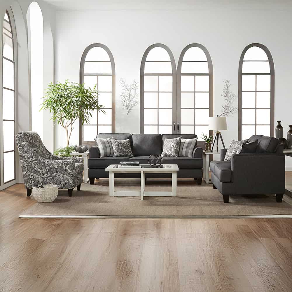 With a sharp contemporary style and environmentally friendly and comfortable cushions you’ll have the ultimate modern living room when you bring home this Sofa and loveseat. The arm combines the look of a flare tapered arm with that of a track arm to create its own look while the t-cushion adds a casual flair without compromising the sleek horizontal and vertical lines of the Sofa and loveseat. Wood block feet complete the contemporary look to create the ideal set for your living room.