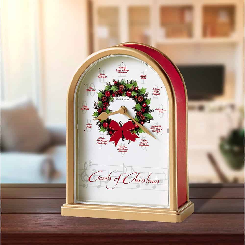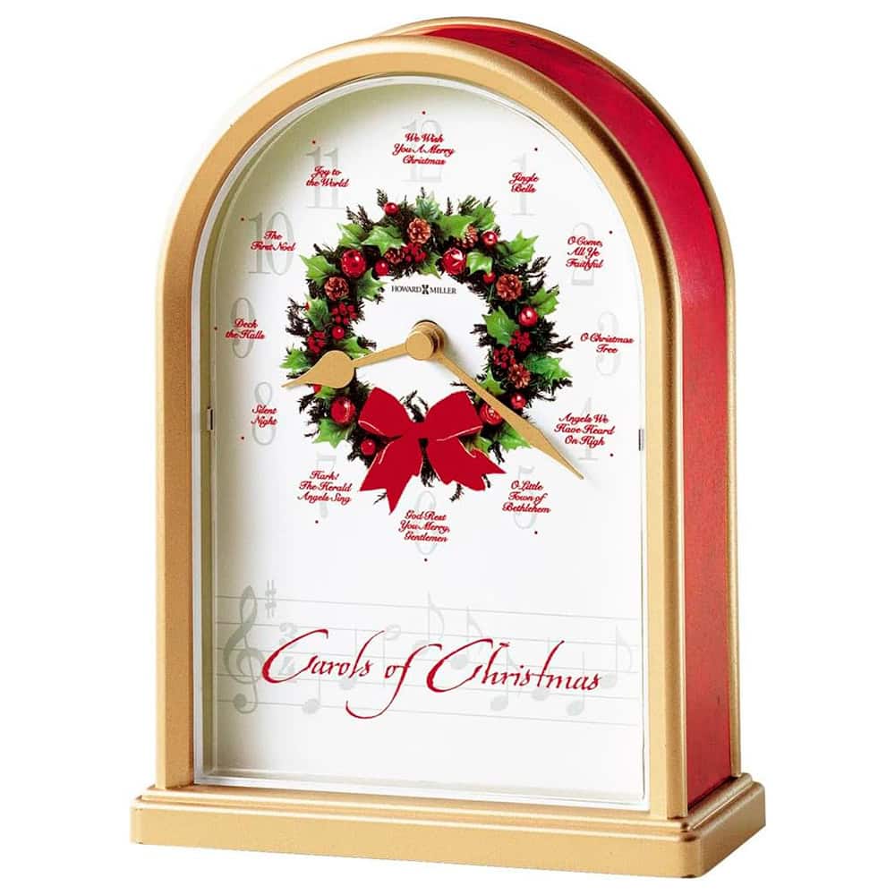 This satin brass-finished table clock features red marble-tone sides and a decorative wreath at the center of the dial. This original, signed artwork was commissioned by Howard Miller exclusively for the Sounds of the Season Collection. As the hour hand moves from hour to hour, you’ll hear these carols featured at the hour: (1) Jingle Bells, (2) O Come All Ye Faithful, (3) O Christmas Tree, (4) Angels We Have Heard on High, (5) O Little Town of Bethlehem, (6) God Rest You Merry Gentlemen, (7) Hark! The Herald Angels Sing, (8) Silent Night, (9) Deck the Halls, (10) The First Noel, (11) Joy to the World, (12) We Wish You a Merry Christmas. An acrylic crystal protects dial and gold-tone hands. Quartz, battery-operated movement automatically shuts off during the nighttime hours and includes three AA sized batteries. Automatic nighttime chime shut-off option.