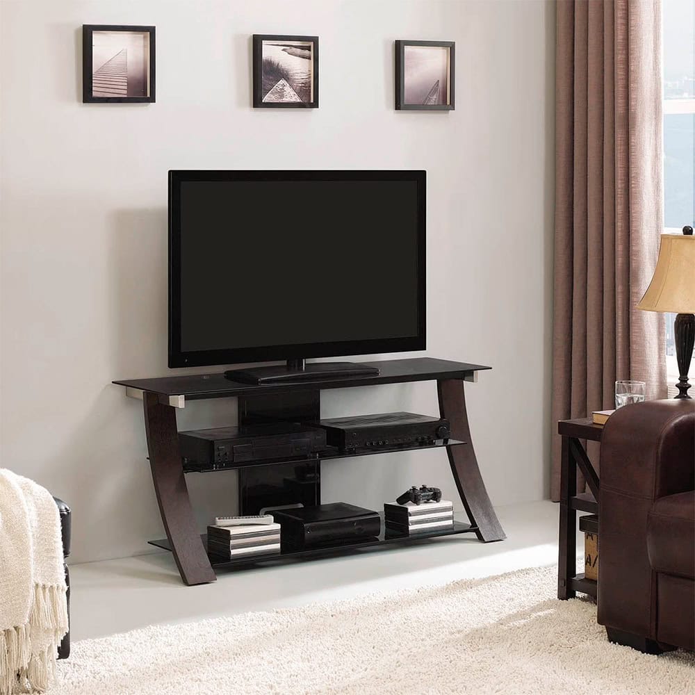 This contemporary design features a curved wood frame with Gray tinted tempered safety glass shelves. It can accommodate most flat screen TVs up to 55″ or up to 125 lbs. and at least four audio video components. The open architecture provides superior ventilation and includes an integrated CMS® Cable Management System to hide and organize unsightly wires and cables