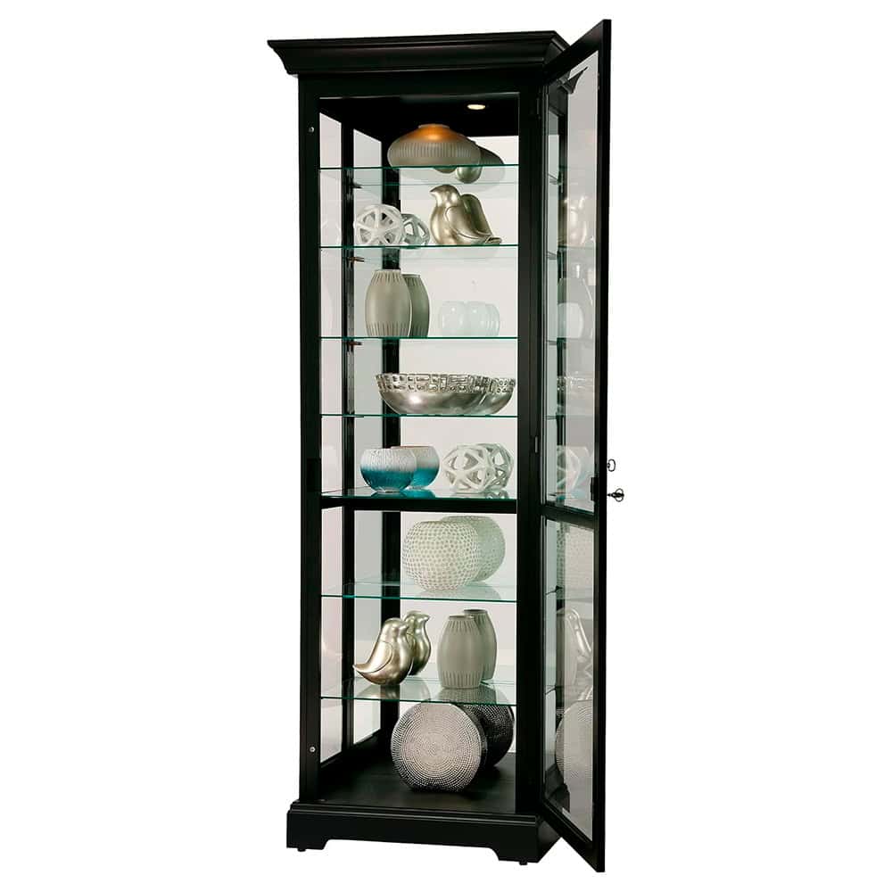 Careful Craftsmanship: This beautifullighted curio cabinet features a black satin finish on select hardwoods andveneers.