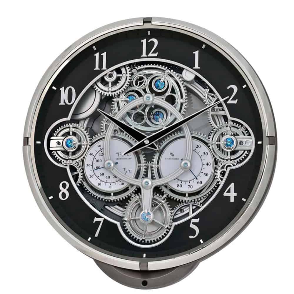 We give you the Chronometer. Reminds you of some of the great watches and clocks of the past. On the hour, the gears take a move, meanwhile, the dial takes a full revolution around while playing one of 30 melodies. It reads the temperature, moisture has motion, and it tells time. Designed beautifully with a continuous rotating gear at the bottom and 6 Crystals. The clock is battery quartz operated.