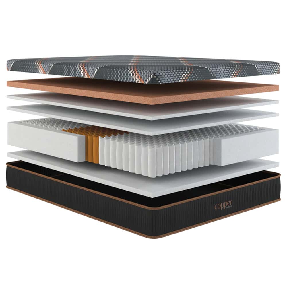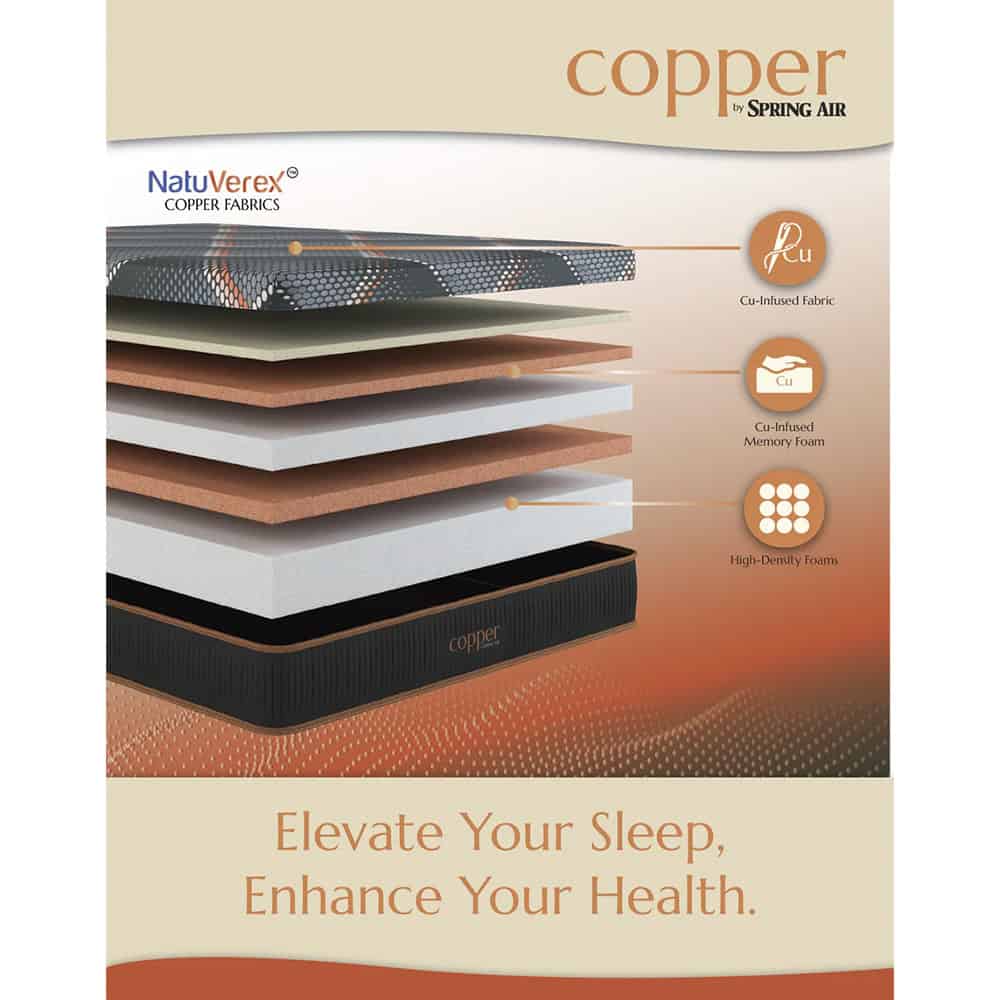 Indoor Furniture, MattressesThe Copper by Spring Air Hybrid Quilted models provide wellness while you sleep. Hyper-soft copper infused memory foams complement the responsive 3-Zone 875 Encased Coil Unit with high-density perimeter foam encasement. This hybrid design is paired with the patented Natuverex™ Copper-Infused cover elevating your sleep and enhancing your health.