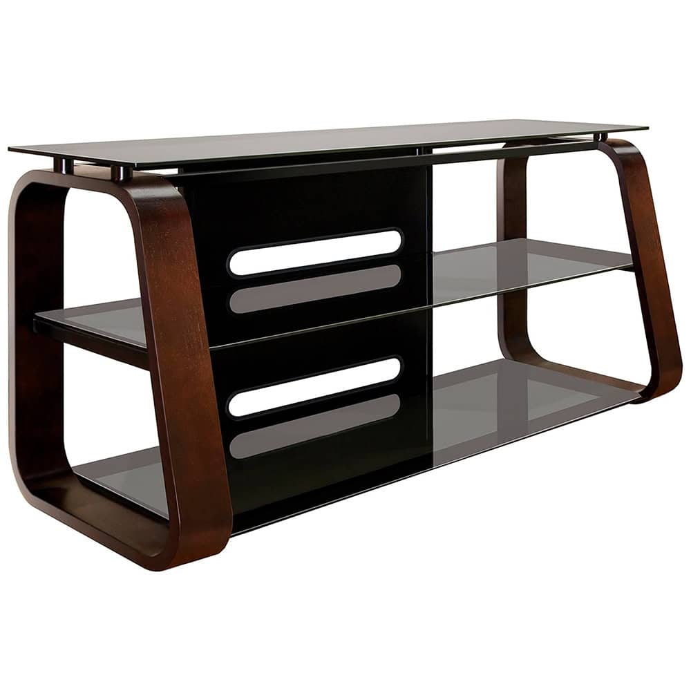 This dynamic audio/video stand is sure to be the center of attention in any living space. It features real curved wood sides in a beautiful Deep Espresso finish and the elegant Black tempered safety glass shelves can accommodate most Flat Panel TVs up to 55″ or 125 lbs., plus at least four audio/video components. The open architecture design provides plenty of ventilation for convection cooling of components while the integrated CMS® Cable Management System easily hides and manages unsightly cables and power cords