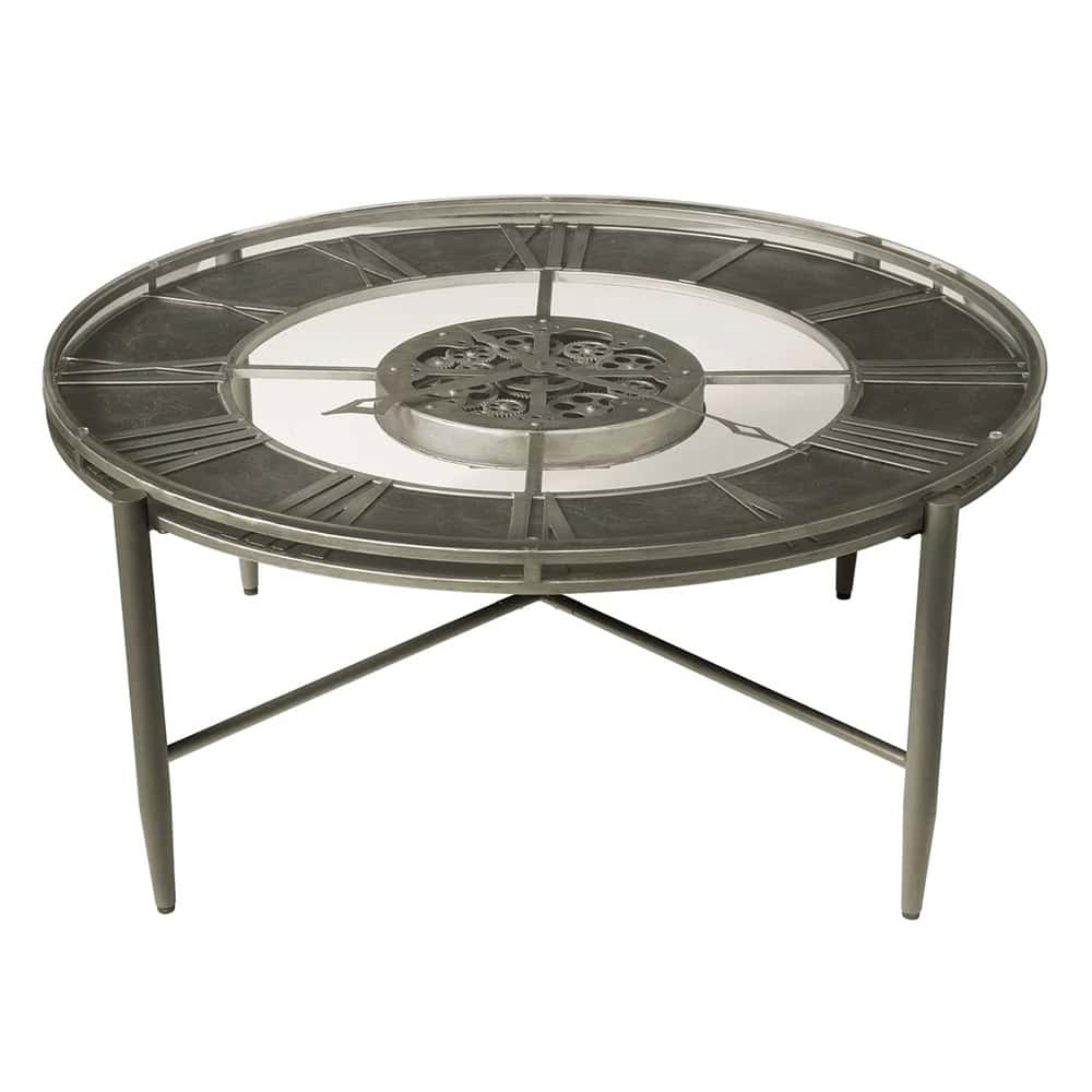 With aged silver-finished hour and minute hands gracefully gliding across the dial, this table not only tells time but also serves as a striking focal point in any space. The tempered glass top adds durability and allows for a clear view of the intricate clock mechanism below.