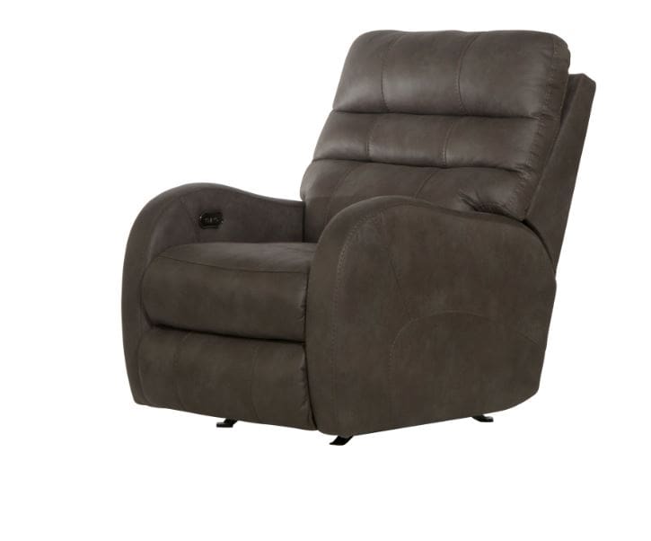Gadson is a Power Rocker recliner with a triple pub back, stylish radius arm, and convenient power button with USB charging port. Choose rich Taupe or cool Steel grey faux leather fabric.