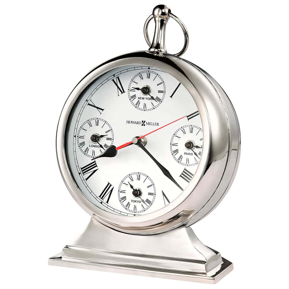These stylish, world time metal accent clocks, 635-212 Global Time by Howard Miller, displays local time and features four smaller dials for displaying time for New York, Paris, London and Tokyo.