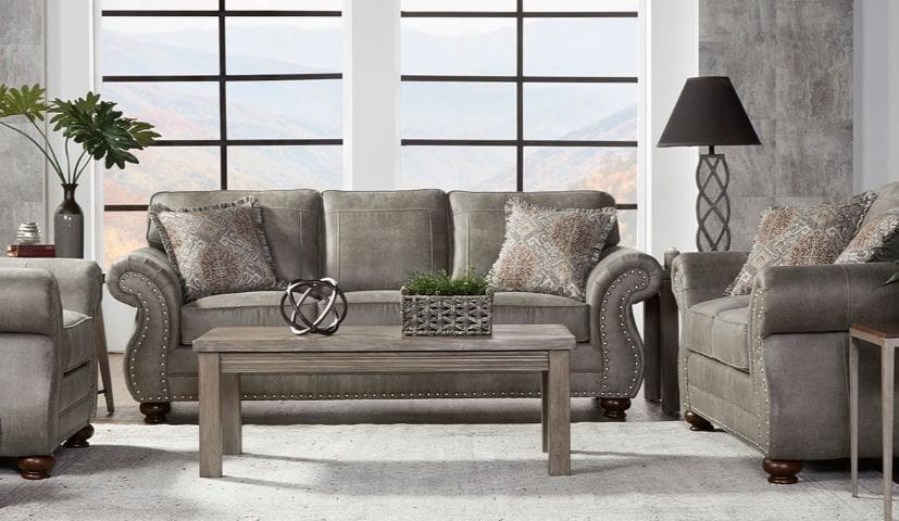 Transitional style featuring leather look microfiber fabric & nailhead accents.