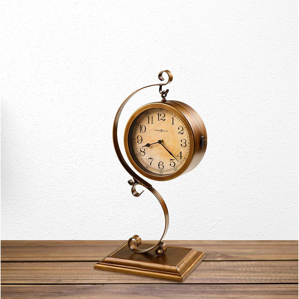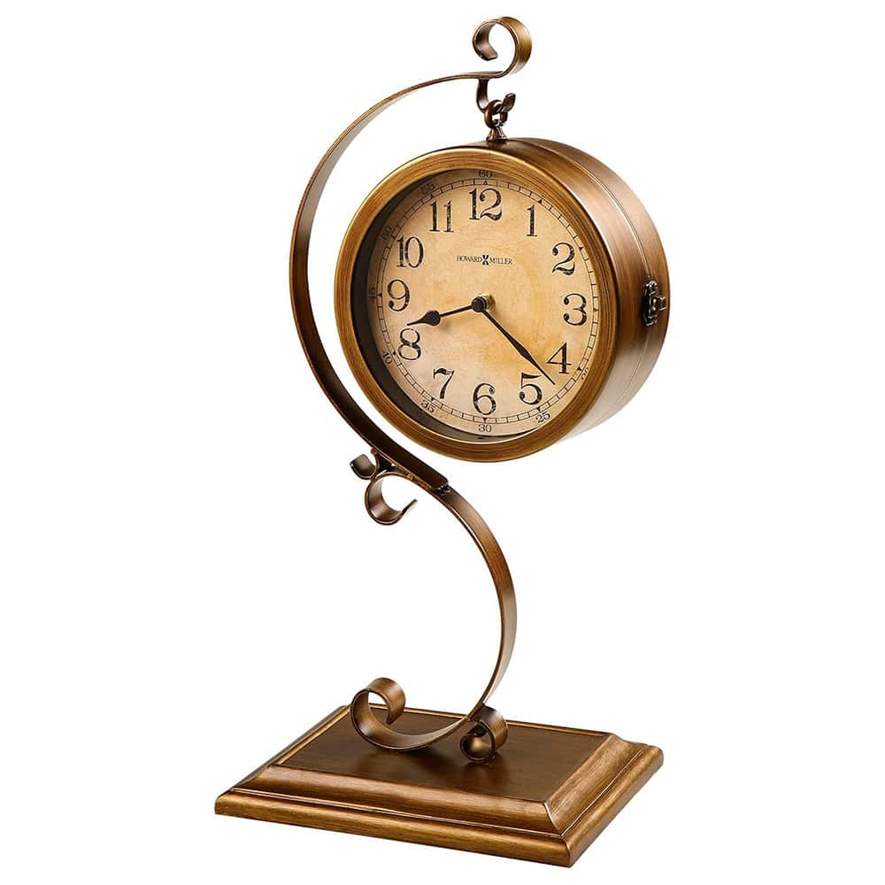 Two-sided sofa table clock, finished in antique brushed brass, is suspended from a bent metal scroll stand that sits on a cast base. The aged parchment dial features a black Arabic numerals, black hour and minute hands and a glass crystal. A full felt bottom protects your tabletop. Quartz, battery-operated movement requires two AA sized batteries (not included). Height 21″ (53 cm) Width 10″ (25 cm) Depth 7.25″ (18 cm)