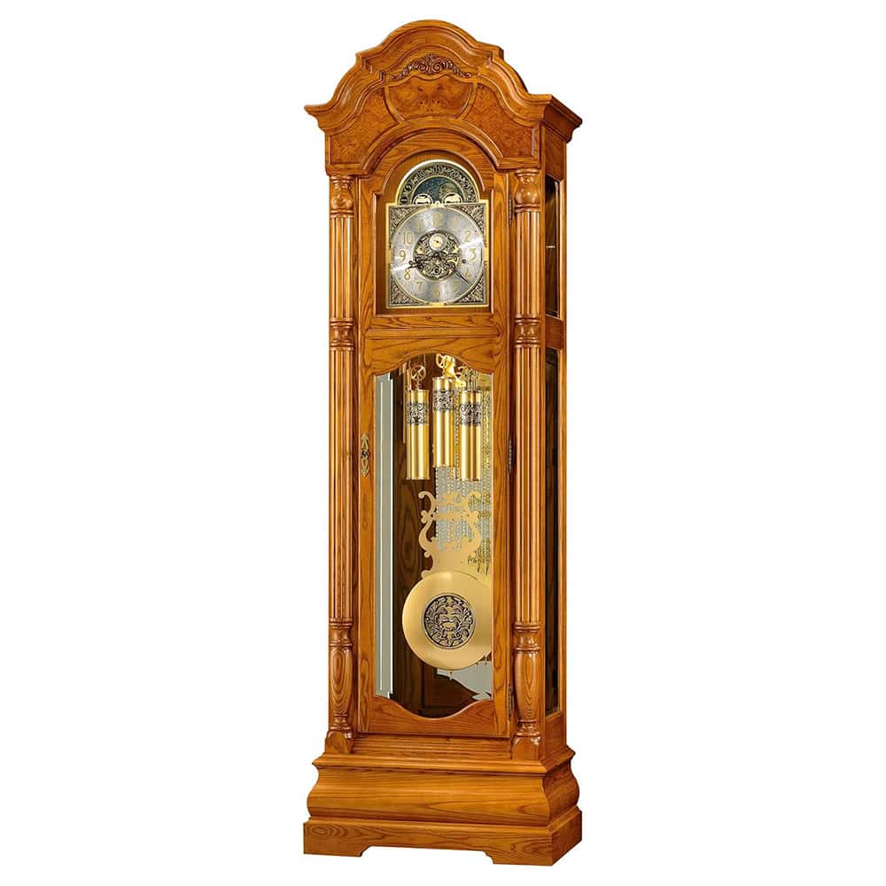 Golden Oak finish on select hardwoods and veneers. Bonnet pediment features book-matched, olive ash burl overlays framed with decorative carved ornaments. The polished brass-finished dial features a decorative open center which offers a view of the inner workings of the movement, decorative corner ornaments, a moon arch with an astrological blue moon phase, and a silver chapter ring with applied brass Arabic numerals. The polished brass-finished pendulum features a decorative center disk which complements the dial and weight shells. Crystal-cut V-grooved glass in the lower door with beveled glass on the sides. The door also features book-matched, olive ash burl overlays in the corners. Illuminated dial and glass mirrored back. The locking case offers reeded columns with turned top and bottom caps and a sculpted base. A high-precision, German-made, Kieninger® cable-driven, Westminster chime movement plays 1/4, 1/2, and 3/4 chimes accordingly with full chime and strike on the hour. Automatic nighttime chime shut-off option. Four floor levelers levels the cabinet on any surface. Designed and Assembled in the USA. Height 86″ (218 cm) Width 27″ (69 cm) Depth 16″ (41 cm)