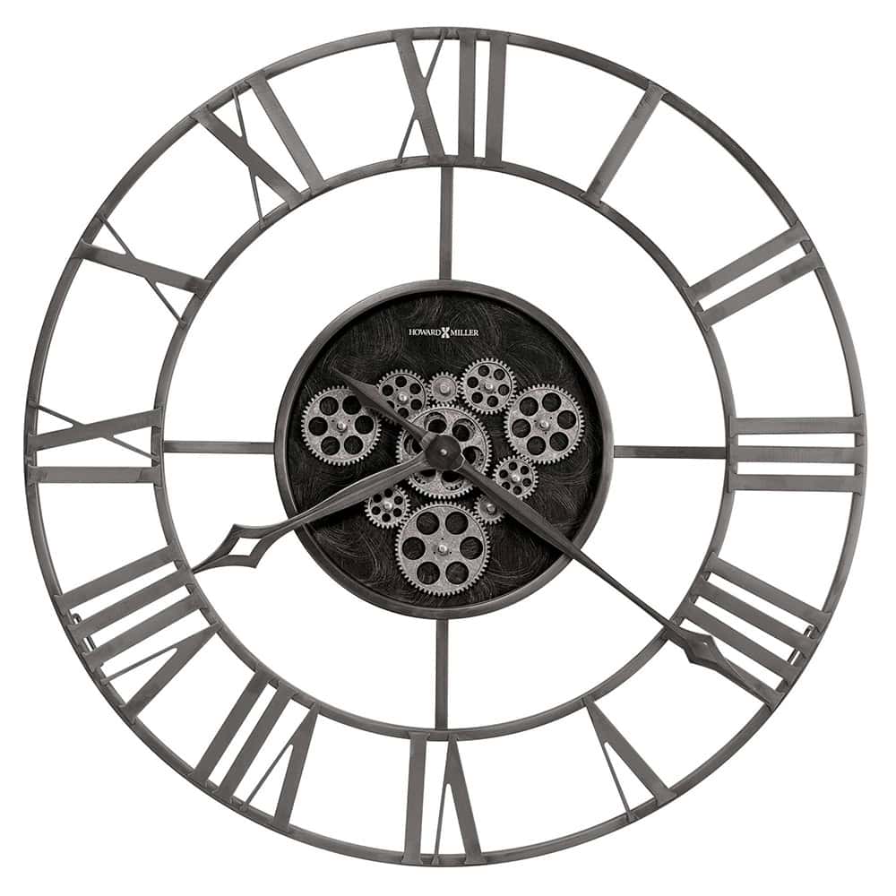 - 32″ aged silver finished wall clock with machined steel finish with grind marks and distressing and blackened steel finished center with moving, galvanized steel finished gears.