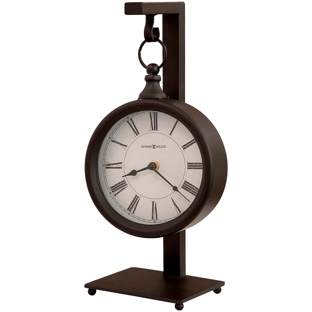 Metal Antique Black Finished, Rustic Clock Hangs on 14.25-inch Stand, Distressed Black Roman Numerals, Quartz Movement