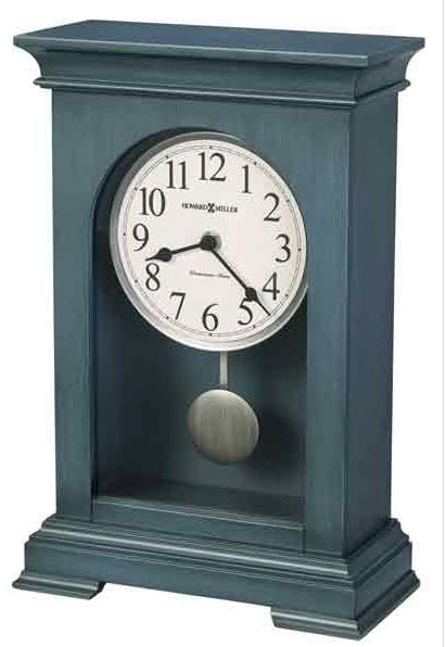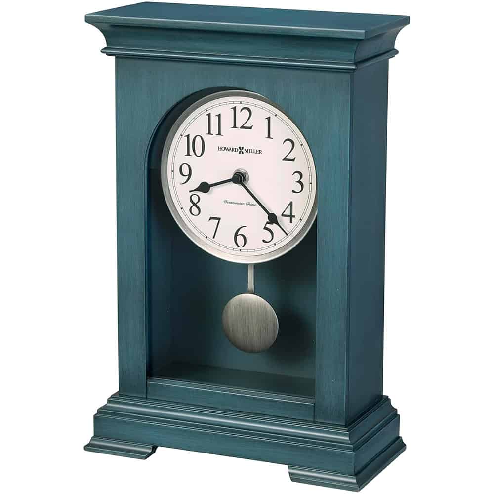 The 635-260 Loreen Mantel Clock features an antique ocean blue finish on a wood case that adds charm to any décor. The easy-to-read white dial has black Arabic numerals and a minute track and is complemented by contrasting matte black-finished hour and minute hands. The pendulum features a matching brushed, aged silver-finished bob and metal stick.