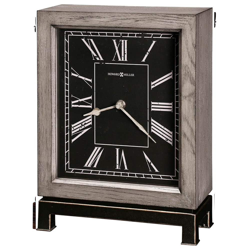 This unique mantel clock features a warm gray finished case on select hardwoods and veneers and a metal base finished in charcoal with silver edging. The aged black dial has white Roman numerals and minute track, and antique white spade style hands. Quartz battery operated movement requires one AA size battery.