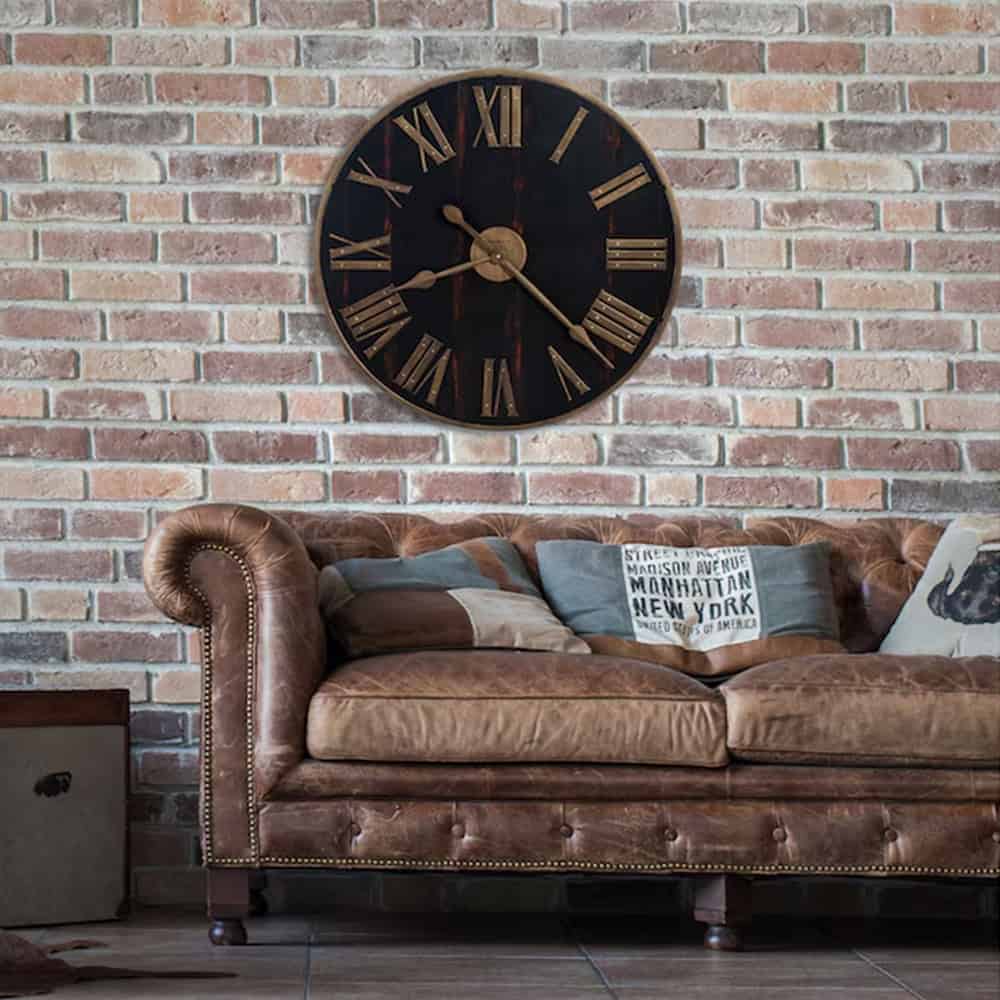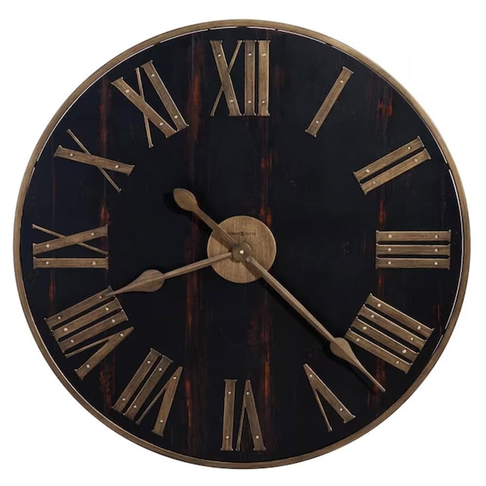 An impressive 31″ gallery wall clock with a metal outer frame finished in antique brass. A worn black dial delivers a planked appearance with applied antique brass-finished Roman numerals and center disk, and antique brass-finished hands. Quartz, battery-operated movement requires one AA sized battery.