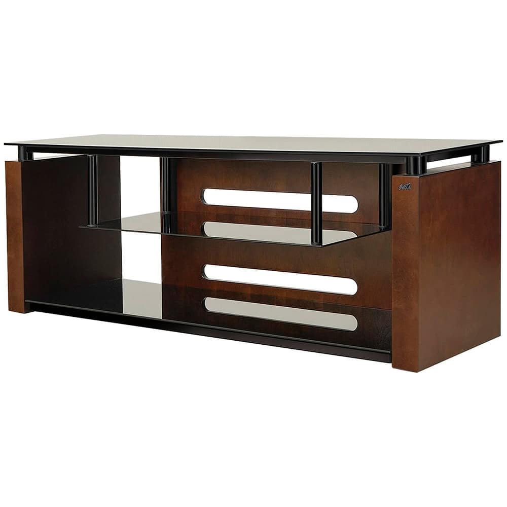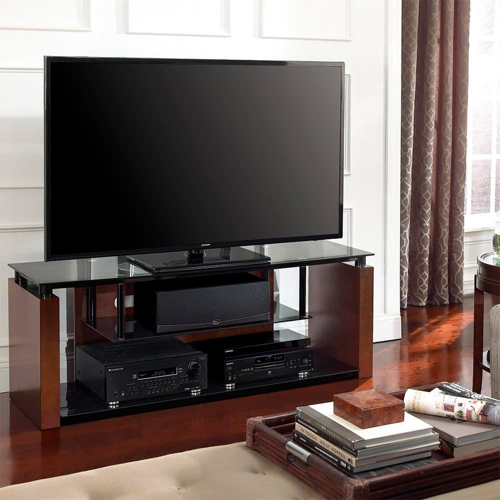 Contemporary TV stand featuring Espresso finish sides with dark smoked glass shelves.
