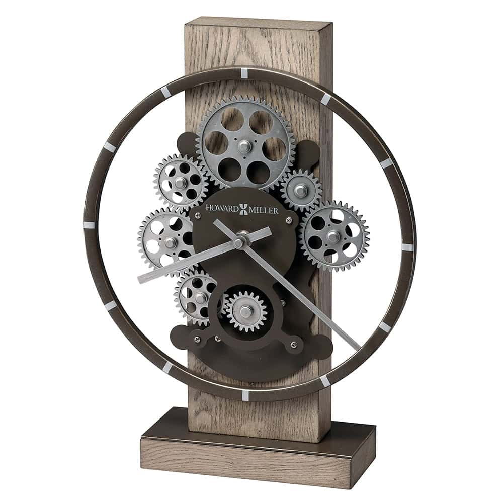 One of the most striking features of this clock is the presence of seven satin silver gears that turn in motion. These moving gears in the center create a visually captivating effect and make it a standout piece for any mantel or tabletop. The use of a charcoal finished top baseplate and dial ring complements the Seaside Gray wood and adds contrast to the design, enhancing the clock’s aesthetic appeal.