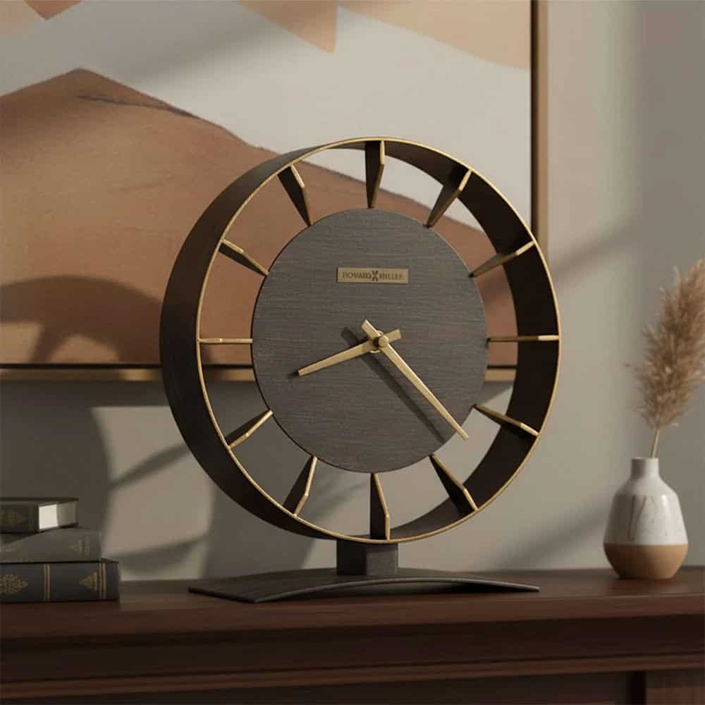 This unique metal mantel clock, with its circular and wedged metal shapes, is inspired by those artists that create beauty out of found or stamped metals. The 8.75″ diameter clock sits on a curved base and is finished in brown with reddish undertones and gold highlights on the front of the frame and the hour markers. Dial features a flat center disk that is joined to the outer case by metal plates, which also serve as hour markers, and is contrasted by antique gold-finished hour and minute hands. Quartz, battery-operated movement requires one AA sized battery (not included).