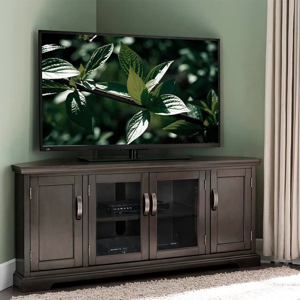The Riley Corner Entertainment Center features a fashionable grey finish with silver hardware & holds up to a 60″ TV. Constructed of hardwood solids & veneers.