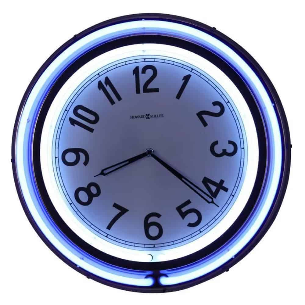 Stealing the Spotlight: If there’s a surefire way to turn attention to a wall, it’s with a metal wall clock bathed in neon. The soft glow comes courtesy of an inner white ring and a blue outer ring, both powered by an included UL Listed adapter. The effect is cool, crisp, and flawless, particularly as they shine against the bright white dial in the center. It’s adorned with black Arabic numerals and black finished hands behind a flat glass crystal.