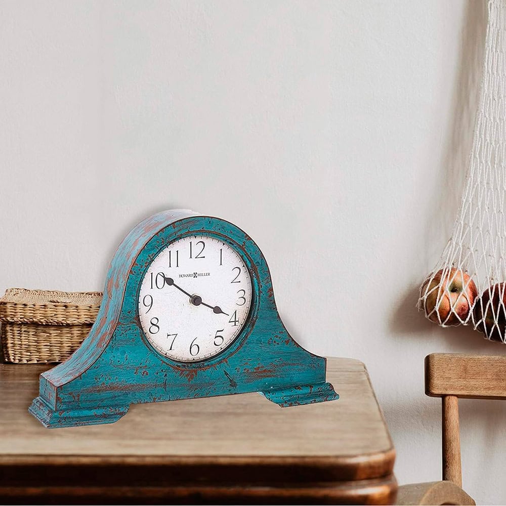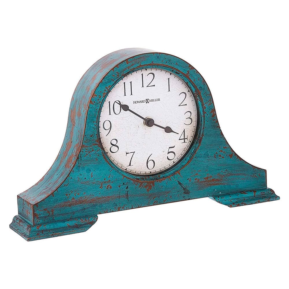 This mantel clock features a classic tambour style case with a worn teal blue finish. A convex glass crystal showcases an aged dial with aged and worn Arabic numerals and black spade hands. Felt bottom protects the table or desktop surface. Quartz, battery-operated movement requires one AA sized battery.