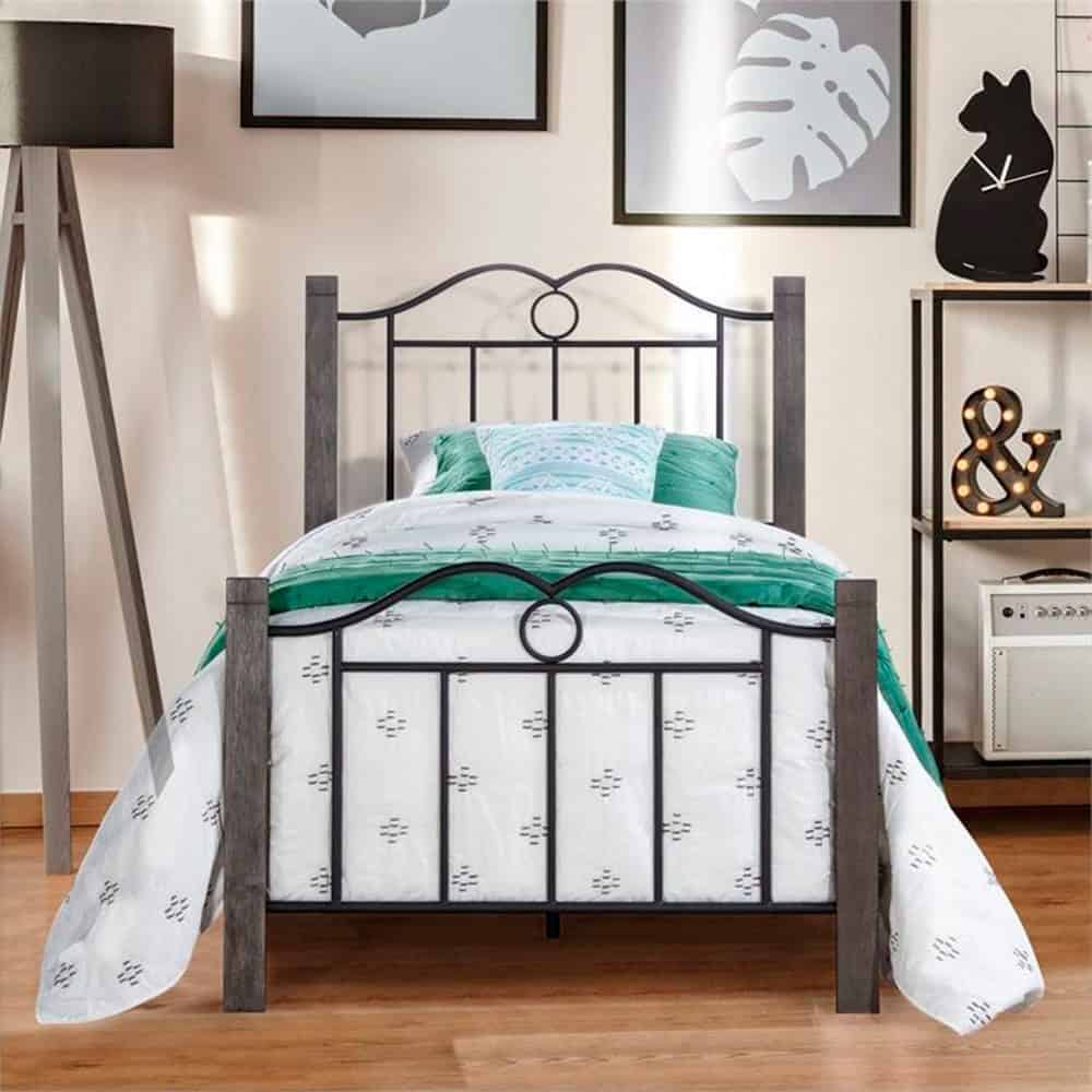 - Twin-size metal headboard in a textured black finish with double arched and spindle design with brushed charcoal wood finished posts