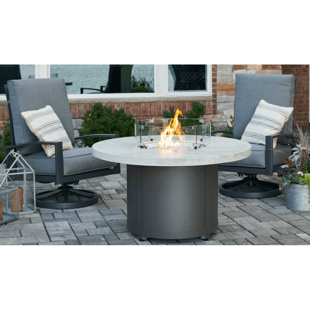 The Beacon Gas Fire Pit Table Collection is a beautiful new take on a classic style. The unique White Onyx Supercast™ concrete top sits upon the durable powder-coated steel base. Chat height naturally invites guests to the sit around the fire and relax. The 20" Crystal Fire® Plus Burner is UL Listed for safety.